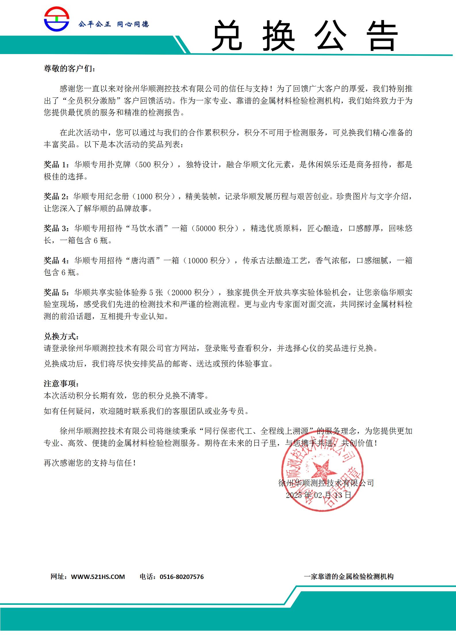 徐州華順測控技術有限公司客戶積分兌換公告